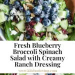 A vibrant and refreshing Blueberry Broccoli Spinach Salad featuring fresh baby spinach, crunchy broccoli, ripe avocado, juicy blueberries, and tangy feta cheese, all tossed in a homemade creamy ranch dressing packed with herbs and spices. Perfect for a quick, nutritious, and flavorful meal or side dish.