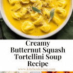 A cozy fall soup combining roasted butternut squash, fragrant fresh herbs, and cheesy tortellini. This creamy and comforting butternut squash tortellini soup is perfect for chilly days and offers a delightful blend of sweet, savory, and creamy flavors.