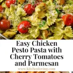 A light green salad dressed with lemon vinaigrette complements the richness of this Chicken Pesto Pasta with Cherry Tomatoes and Parmesan Recipe perfectly. Alternatively, some garlic bread or a crisp focaccia rounds out the meal nicely without overpowering the delicate pesto flavors.
