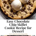 A warm, gooey chocolate chip skillet cookie baked directly in a cast iron pan, perfect for sharing. This easy-to-make treat features a buttery, chewy texture with melty chocolate chips and is ideal for serving straight from the skillet with optional vanilla ice cream on top.