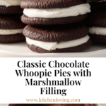 Classic homemade Whoopie Pies featuring soft, fluffy chocolate cake rounds sandwiched with a creamy marshmallow filling. These delightful treats are perfect for sharing and offer a fudgy, melt-in-your-mouth texture when served chilled.