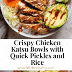 Crispy Chicken Katsu Bowls featuring tender boneless chicken thighs breaded and fried to golden perfection, served over fluffy white rice with pickled cucumbers and carrots, thinly sliced cabbage, scallions, and drizzled with spicy mayo and tonkatsu sauce. A perfect balance of crunchy textures and bold flavors for a satisfying weeknight dinner.