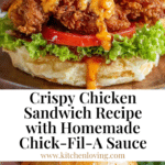 This Crispy Chicken Sandwich recipe features tender chicken breasts marinated in a buttermilk mixture, coated in a seasoned flour and cornstarch breading, and fried to golden perfection. Served on toasted brioche buns with cheddar cheese, fresh lettuce, tomato, pickles, and Chick-Fil-A sauce, it’s a flavorful and crunchy sandwich perfect for lunch or dinner.