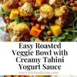 Reheat your roasted veggies and chickpeas in the oven or air fryer to regain their crispness. Avoid microwaving if possible, as it can make the chickpeas soggy. Add the tahini yogurt sauce fresh after reheating for the best flavor experience.