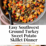 This Southwest Ground Turkey Sweet Potato Skillet is a quick, flavorful, and nutritious one-pan meal perfect for weeknight dinners or meal prepping. Combining lean ground turkey, tender sweet potatoes, colorful bell peppers, and southwestern spices, it’s a hearty dish topped with melted cheese and fresh cilantro for a satisfying finish.