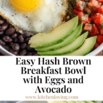 A hearty and flavorful Hash Brown Breakfast Bowl featuring crispy shredded potatoes, sautéed vegetables, black beans, pico de gallo, creamy avocado, and a soft-fried egg, perfect for a satisfying morning meal.