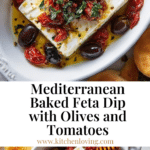 This Mediterranean Baked Feta Dip is a savory and aromatic appetizer featuring a block of creamy feta cheese baked with Kalamata and green olives, grape tomatoes, and a fragrant olive oil marinade infused with garlic, herbs, and a touch of honey. Warm and melty, it’s perfect for dipping with pita or pita puffs, delivering a burst of Mediterranean flavors in every bite.