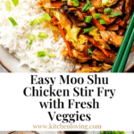 Moo Shu Chicken is a quick and easy Chinese-inspired dish featuring thinly sliced chicken breast seared to perfection and combined with tender sautéed vegetables. This flavorful stir-fry is finished with a tangy and slightly sweet sauce made from hoisin, soy sauce, and rice vinegar, complemented by tender strips of scrambled egg for a satisfying, well-balanced meal.
