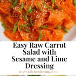 A quick and refreshing Raw Carrot Salad that takes just 10 minutes to prepare. This 5-minute viral TikTok recipe features thinly peeled carrot ribbons tossed with a tangy and sweet sesame dressing, garnished with sesame seeds and green onions for a perfect side dish full of vibrant flavors and crunchy texture.