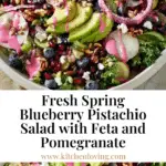This vibrant Spring Blueberry Pistachio Salad combines fresh spring mix and butter lettuce with a colorful array of ingredients including candied pistachios, red onion, watermelon radish, avocado, blueberries, pomegranate arils, and crumbled feta cheese. Tossed together and finished with a creamy pomegranate dressing, this salad offers a delicious balance of sweet, tangy, creamy, and crunchy textures perfect for a light, refreshing meal or side dish.