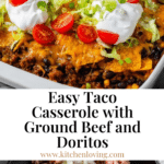 This hearty Taco Casserole combines seasoned ground beef with black beans, corn, and Rotel tomatoes layered with crushed Doritos and melted cheese. Baked to perfection, it’s an easy and flavorful family-friendly dish perfect for a weeknight dinner or casual gathering. Serve with your favorite taco toppings like lettuce, tomatoes, sour cream, and green onions for a satisfying meal.