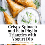 - Serve: Enjoy the spinach and feta triangles warm or at room temperature alongside the chilled yogurt dip.