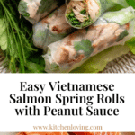 Vietnamese Salmon Spring Rolls (Cá Hồi Cuốn Bánh Tráng) are light and refreshing rolls featuring Asian-style marinated salmon wrapped in delicate rice paper with fresh herbs, crisp vegetables, and vermicelli noodles. These rolls are perfect for a DIY dinner, a summer meal, or as a healthy appetizer, combining savory air-fried salmon with crunchy peanuts and a flavorful Vietnamese peanut dipping sauce.