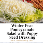 A fresh and vibrant Winter Salad combining crisp Romaine lettuce, juicy pomegranate seeds, and sweet pears with creamy Swiss cheese and crunchy toasted pecans. This salad is beautifully dressed in a homemade poppy seed dressing made with a blend of apple cider vinegar, mustard, and grated onion. Perfect for holiday tables, special occasions, or as a delightful seasonal side dish celebrating the best winter fruits.